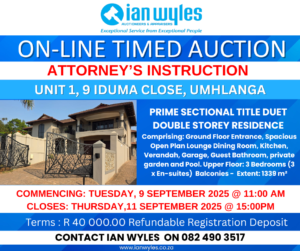 🏠 MULTI PROPERTY AUCTION ❗️ 🏠 THURSDAY ,25 SEPTEMBER 2025 @ 11:00 AM VENUE: THE OYSTER BOX – 2 LIGHTHOUSE ROAD, UMHLANGA ROCKS PRIME DEVELOPMENT IN CENTRAL HILLCREST
