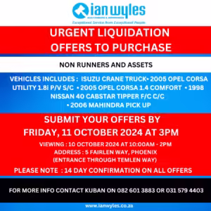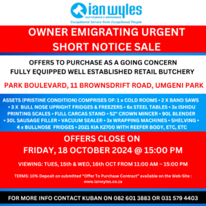 OFFERS TO PURCHASE AS A GOING CONCERN FULLY EQUIPPED WELL ESTABLISHED RETAIL BUTCHERY WITH CURRENT SUPPLIER CONTRACTS PARK BOULEVARD, 11 BROWNSDRIFT ROAD, UMGENI PARK ASSETS