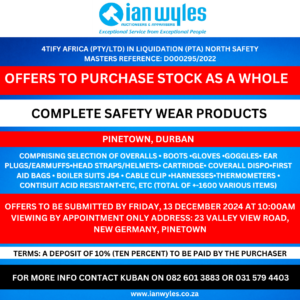 OFFERS TO PURCHASE STOCK AS A WHOLE COMPLETE SAFETY WEAR PRODUCTS PINETOWN, DURBAN COMPRISING SELECTION OF OVERALLS • BOOTS •GLOVES •GOGGLES• EAR PLUGS/EARMUFFS•HEAD STRAPS/HELMETS• CARTRIDGE•